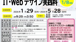 PC教室【訓練生募集中!】職業訓練「IT・Webデザイン実践科」1月29日開校 IT・Webデザイン実践科現在、訓練生募集中です!12月25日にスキルアップスクール岡谷校にて訓練説明会を開催します。興味のある方は是非ご参加ください! 2025.12.18PC教室職業支援職業訓練