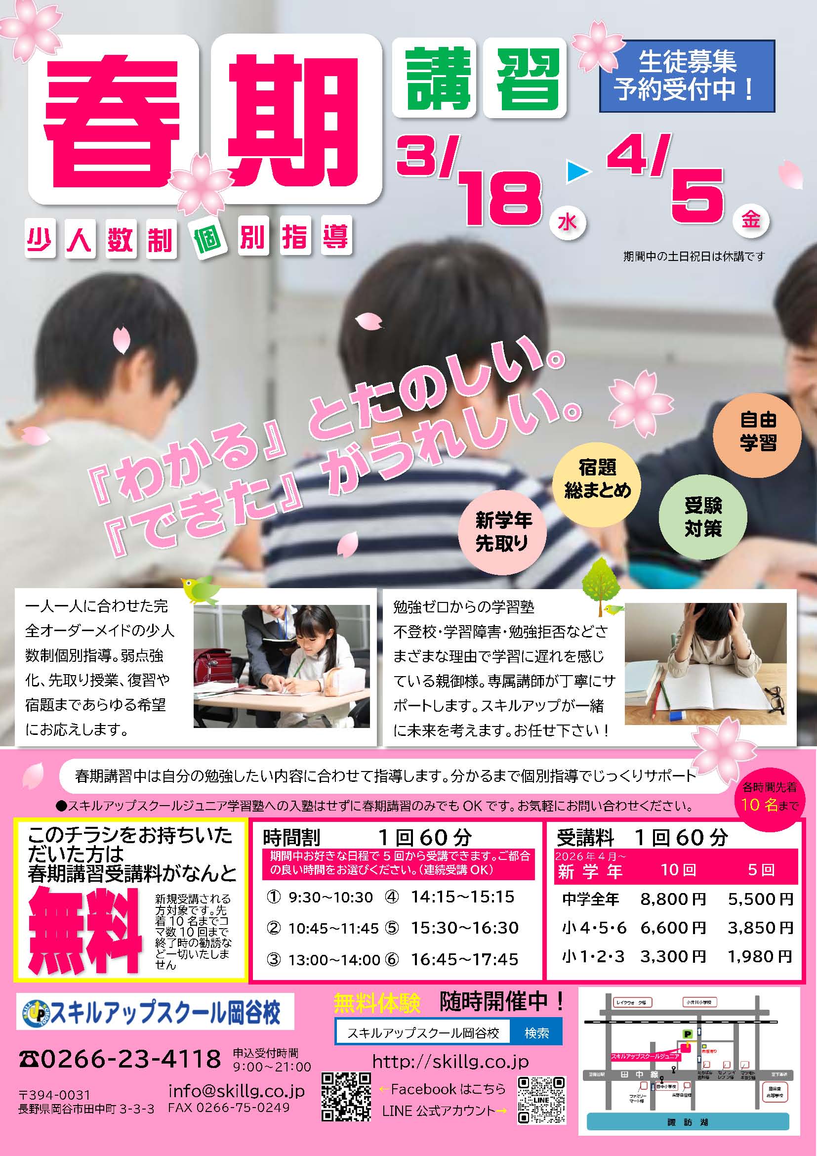 ジュニア学習塾では、今年も春期講習を開催します!春休みにしっかりと勉強をし新年度をスタートしましょう!